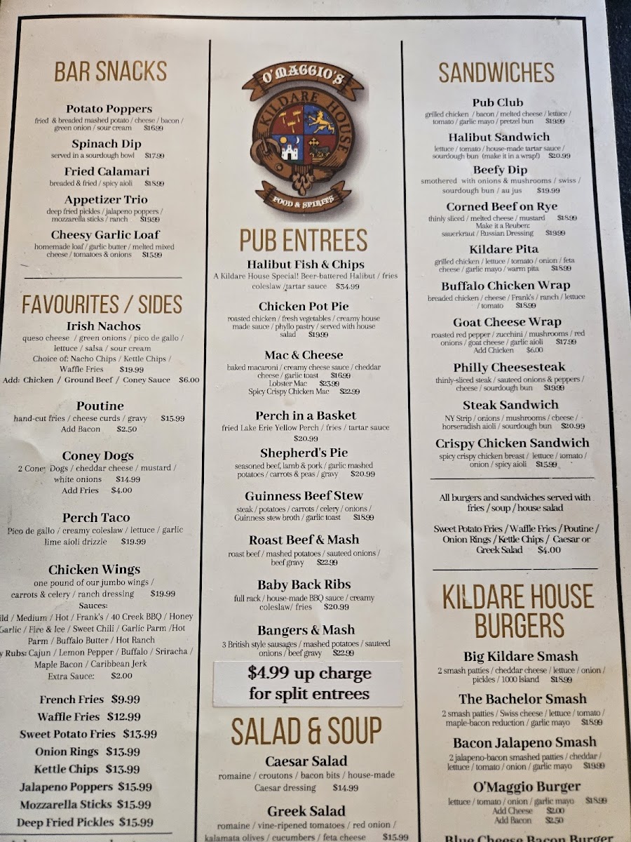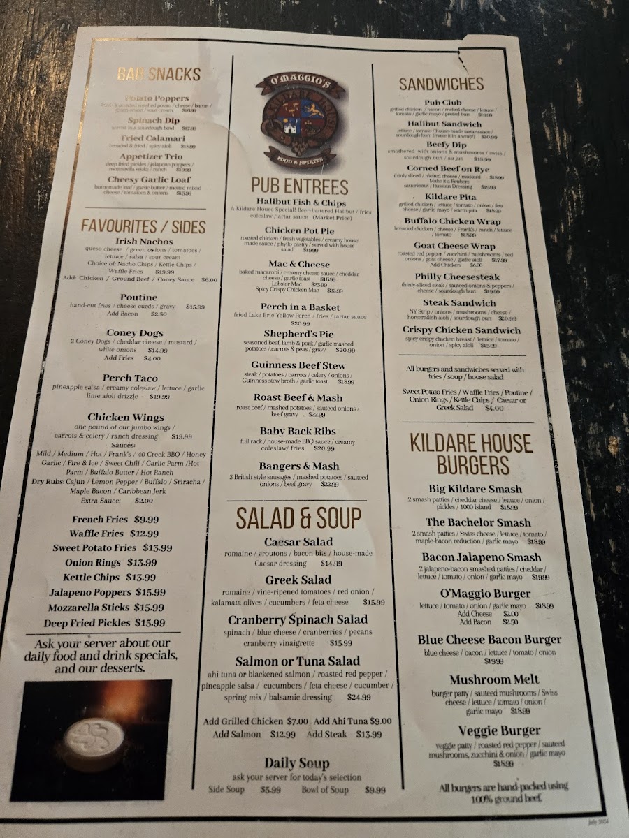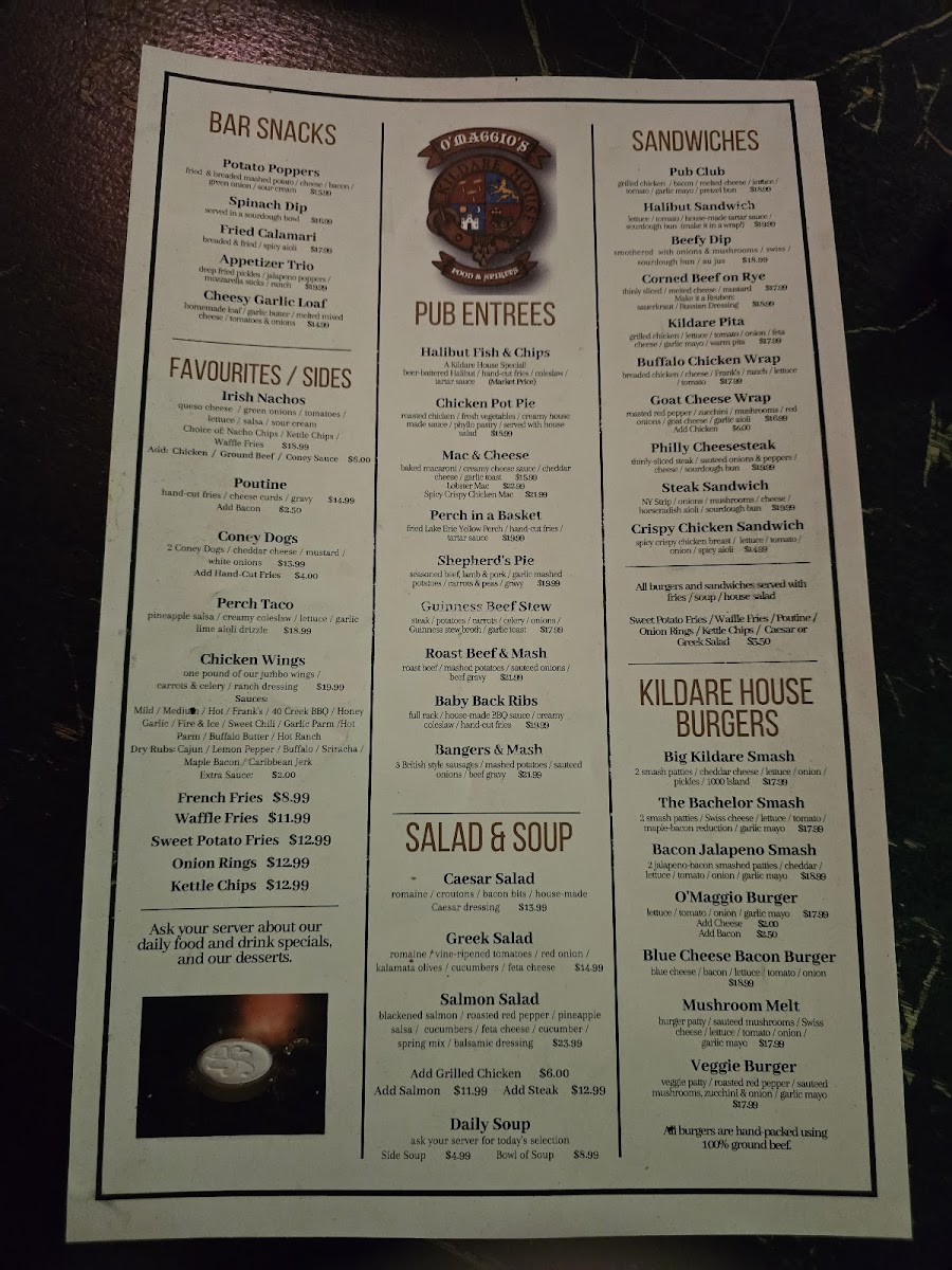 The menu at O'Maggio's Kildare House offers a variety of pub-style and Irish-inspired dishes suitable for casual dining occasions. Guests can choose from an assortment of sandwiches including options like the Pub Club, Halibut Sandwich, Corned Beef on Rye, Philly Cheesesteak, and Steak Sandwich. The food selections also feature shareable appetizers and light bites such as Spinach Dip, Deep Fried Pickles, Hand Cut Fries, and Hot Wings.