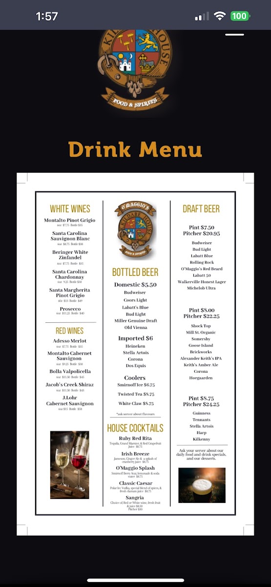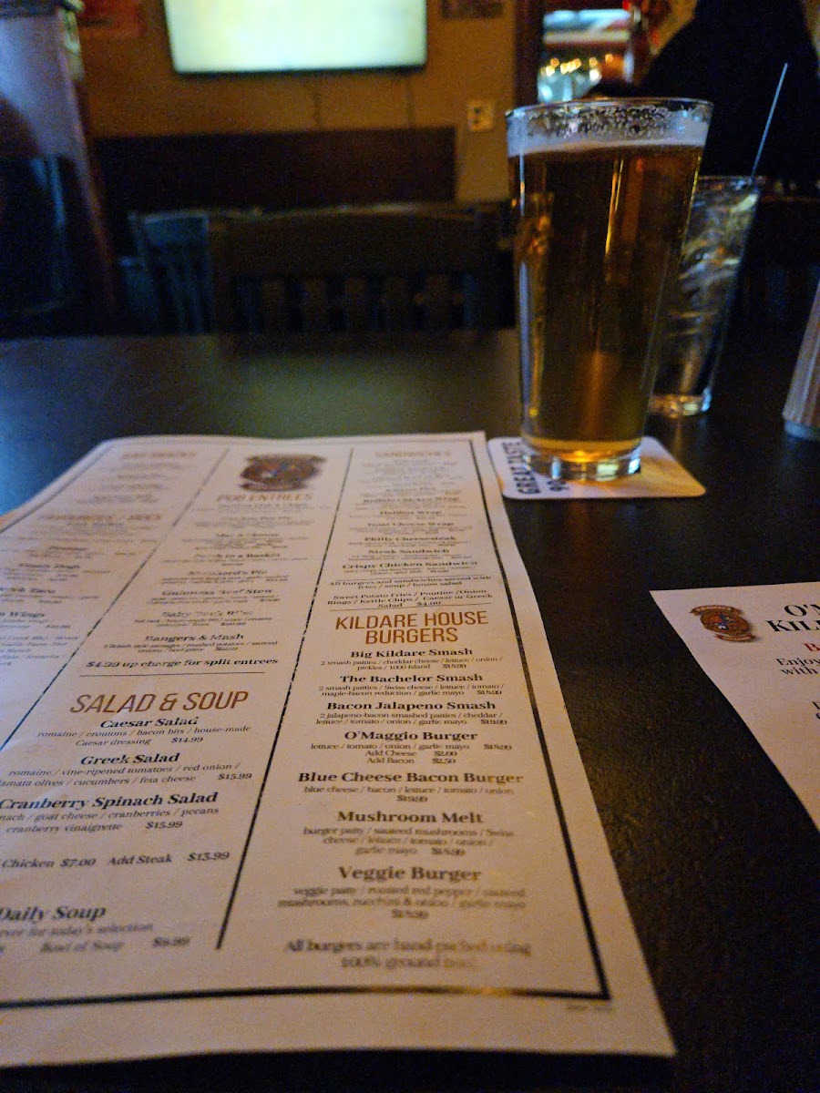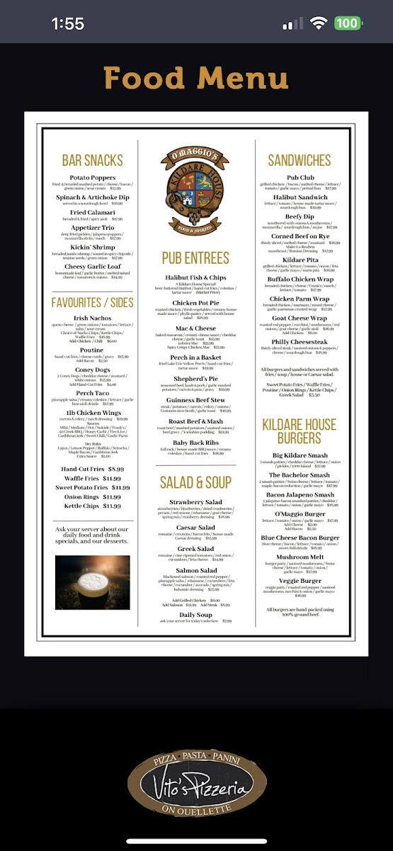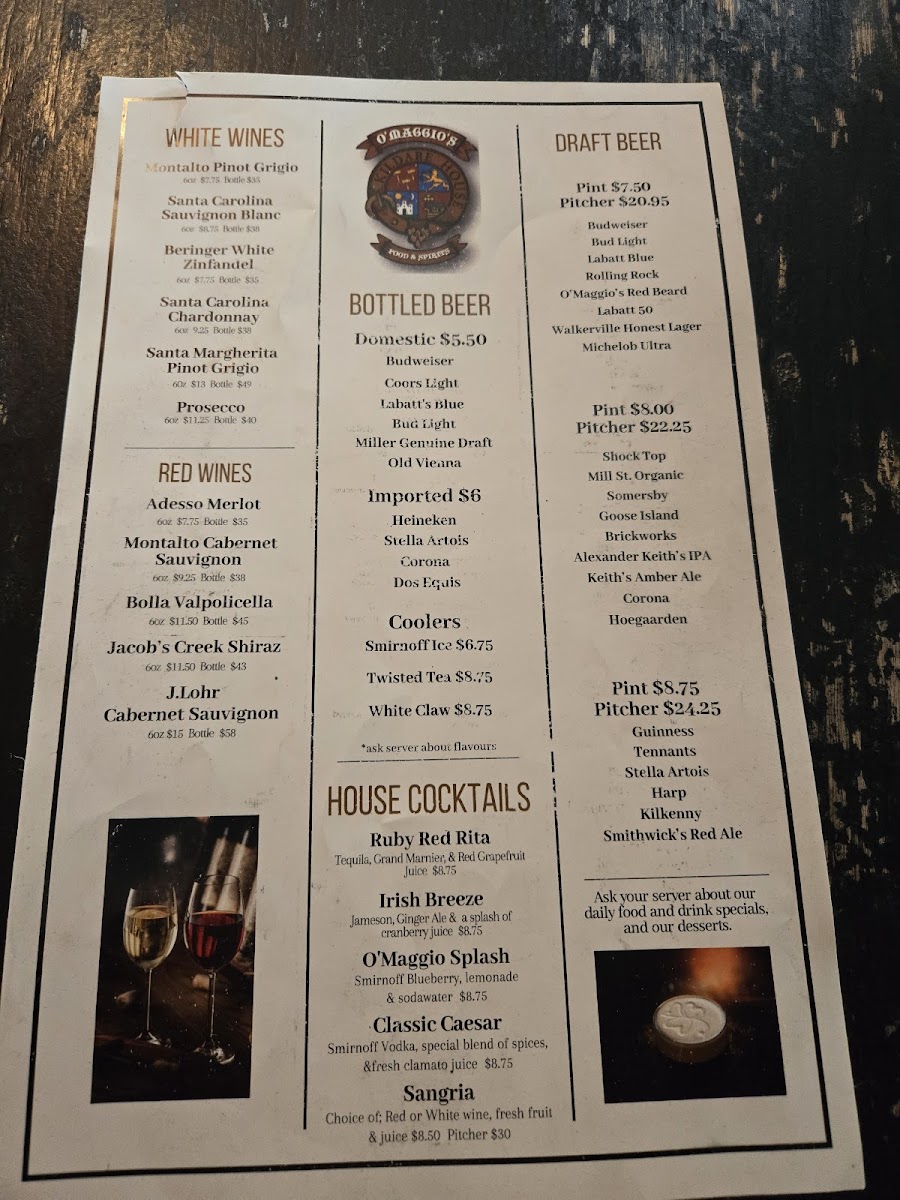 The menu at O'Maggio's Kildare House offers a variety of pub-style and Irish-inspired dishes suitable for casual dining occasions. Guests can choose from an assortment of sandwiches including options like the Pub Club, Halibut Sandwich, Corned Beef on Rye, Philly Cheesesteak, and Steak Sandwich. The food selections also feature shareable appetizers and light bites such as Spinach Dip, Deep Fried Pickles, Hand Cut Fries, and Hot Wings.